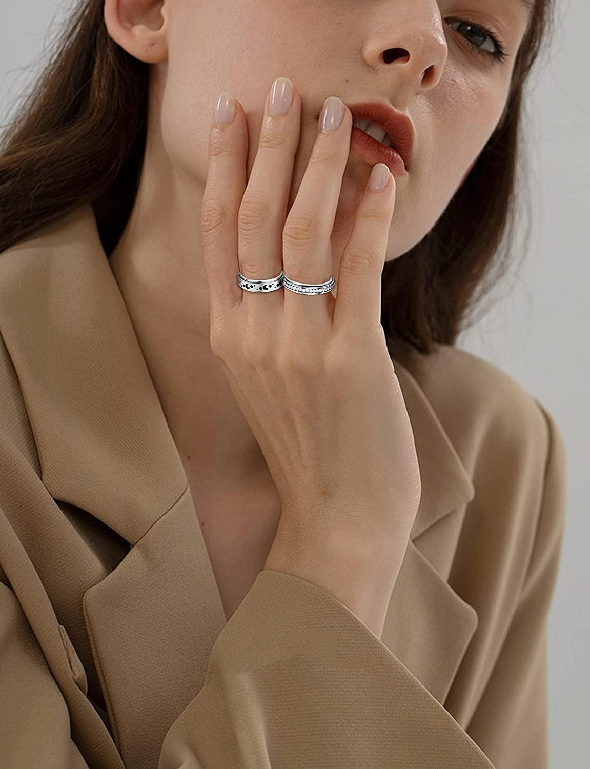[ ANXIETY RING FOR WOMEN ] - One order include 4pcs different style anxiety spinner rings; 1 moon star fidget ring; 1 sand blast spinner ring and 2 cubic zirconia spinner rings. Turn the spinner ring when you feel fidget or anxious; bring you a good mood instantly and add fun; fidget anxiety ring will also help you stop picking fingers or biting nails. Rotatable ring is not only fashion jewelry accessory but fidget toy to stress relief.