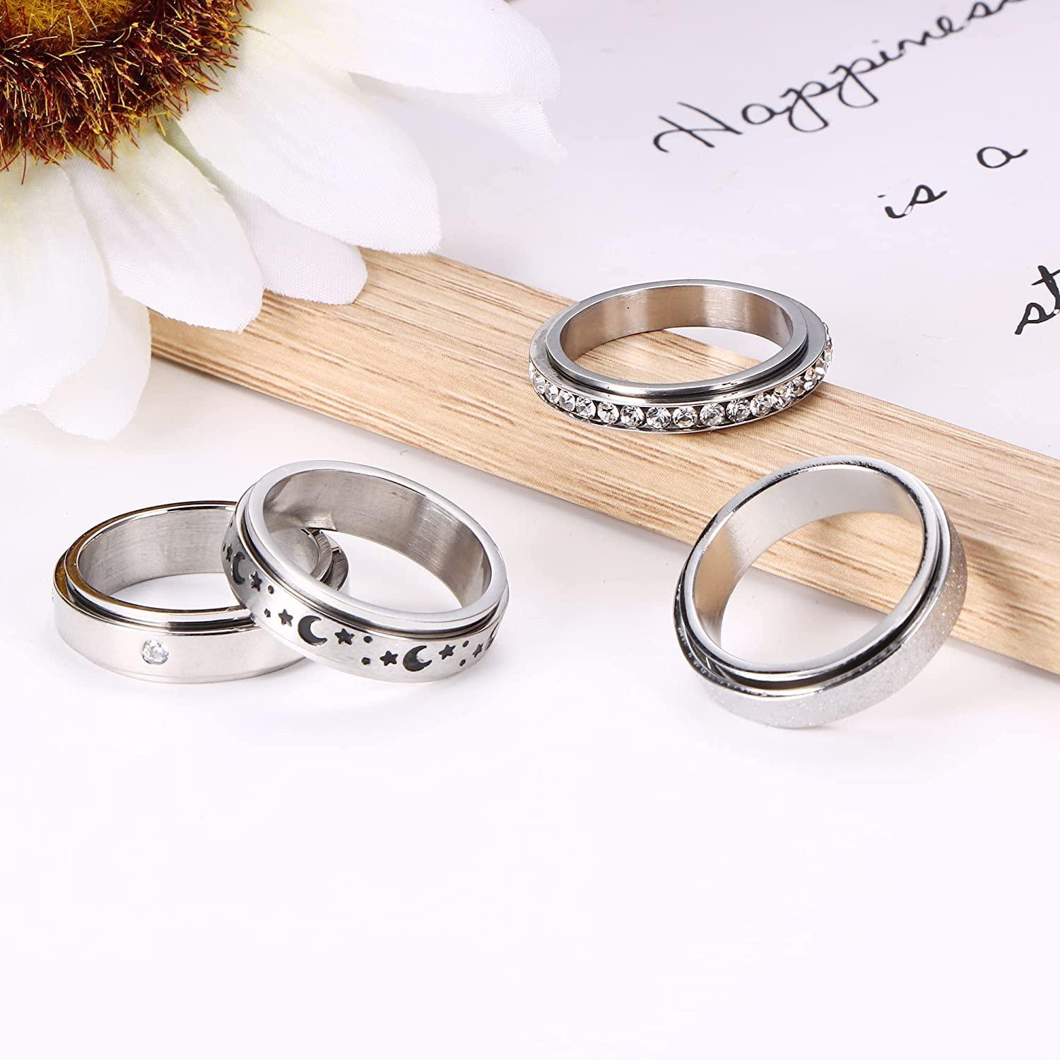 [ IDEAL FIDGET JEWELRY GIFT ] - Fidget band rings; fairly low profile and spin easily; 4 fashion styles can match all your outfit. Spinner anxiety ring is a great gift for people who often feel anxious or stress; girlfriend; daughter; wife; sister; mom; grandma; lover or your friend; bring joy and stress relief for her life. Fidget rings fit any occasion like christmas gift; birthday; valentine's day; anniversary; thanksgiving; mother's day or graduation.