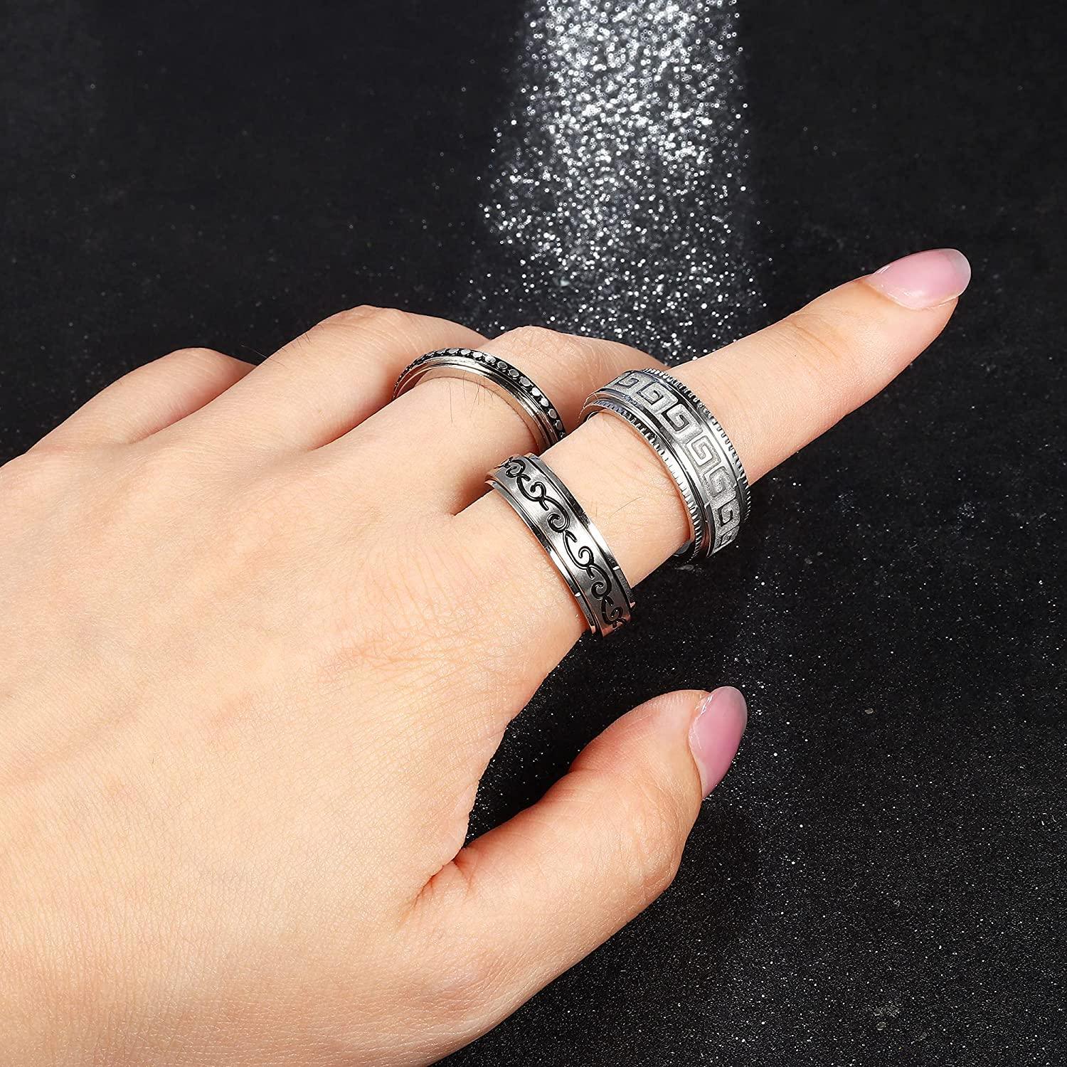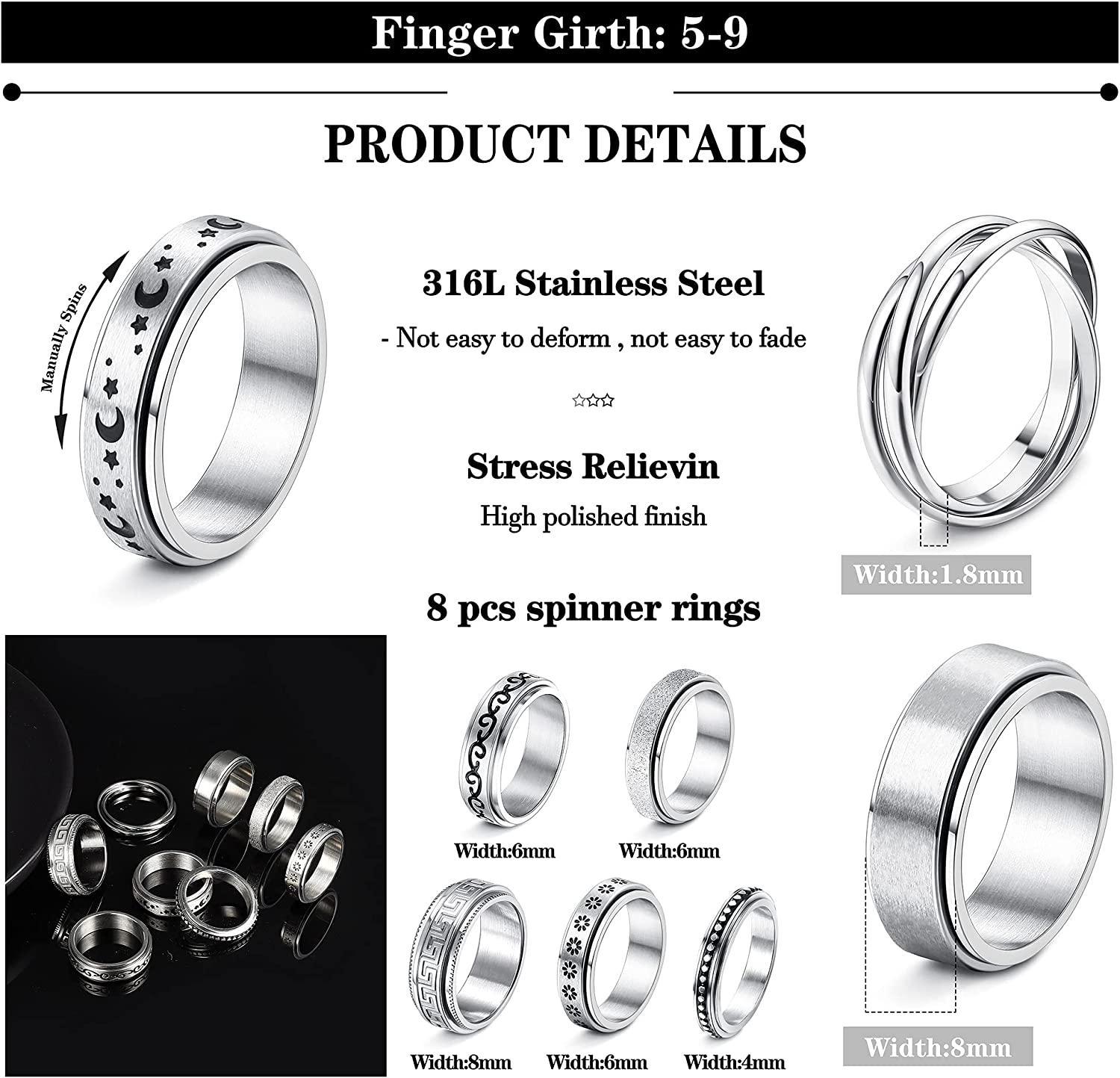 ��SPINNER RING�� One order you will get 8 pcs different style fidget ring: moon star fidget band ring; triple interlocked rolling ring; wide smmoth spinner ring; flower stress relieving meditation rings; sand blast finish wedding promise rings and point spinner ring. a secret fidget ring that helps keep your hands busy.