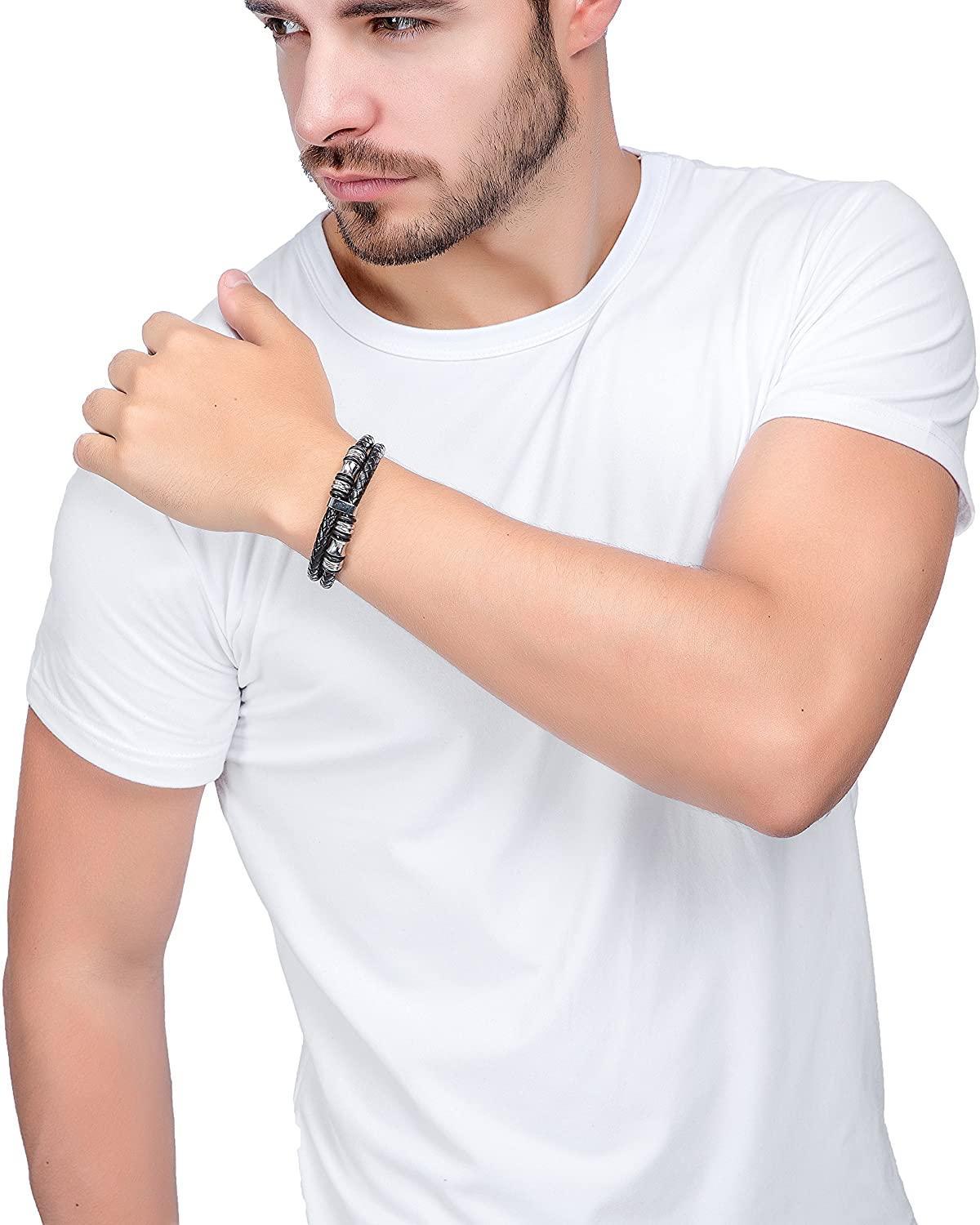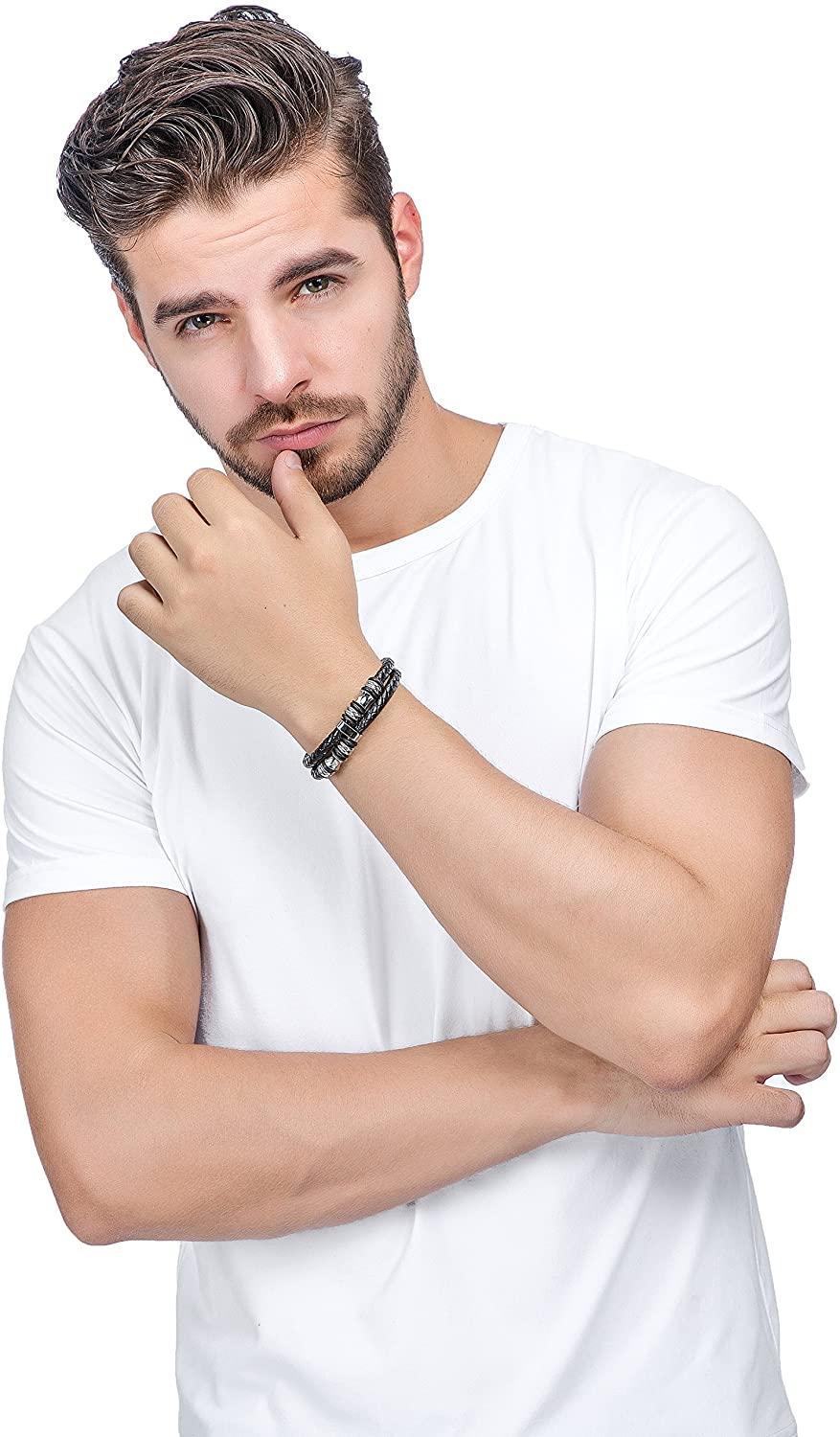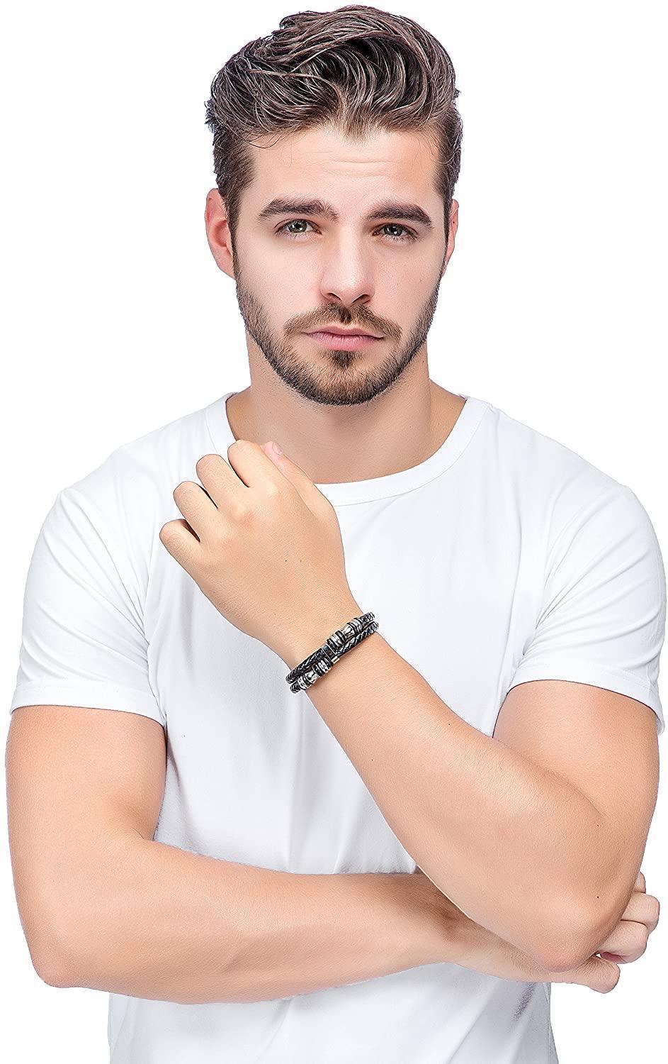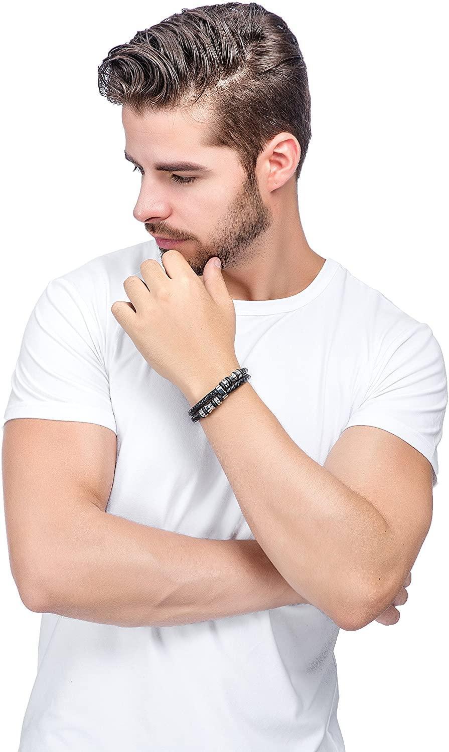Stainless Steel Braided Leather Bracelet Bangle Rope Magnetic-Clasp 8 Inch